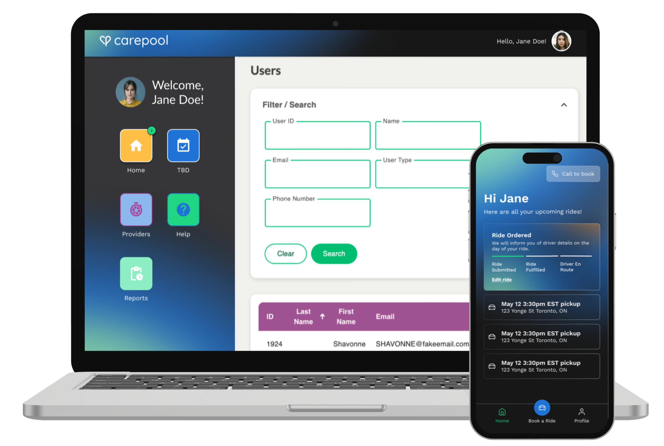 WebApp for health systems, mobile apps for riders. 24/7 human phone support.